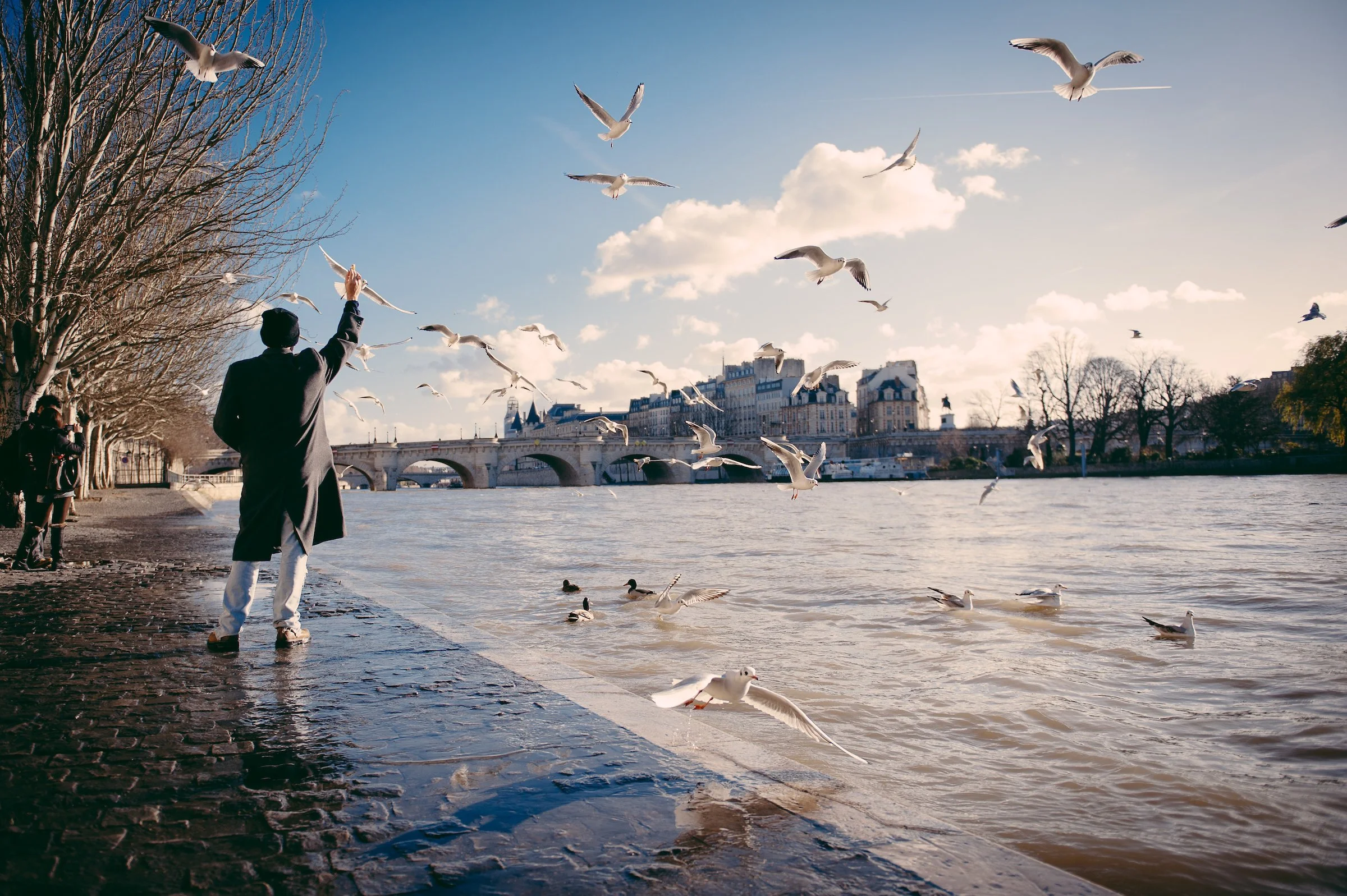 A person releasing seagulls by the river in a cityscape, with buildings, trees, and a bridge in the background on a clear sunny day.