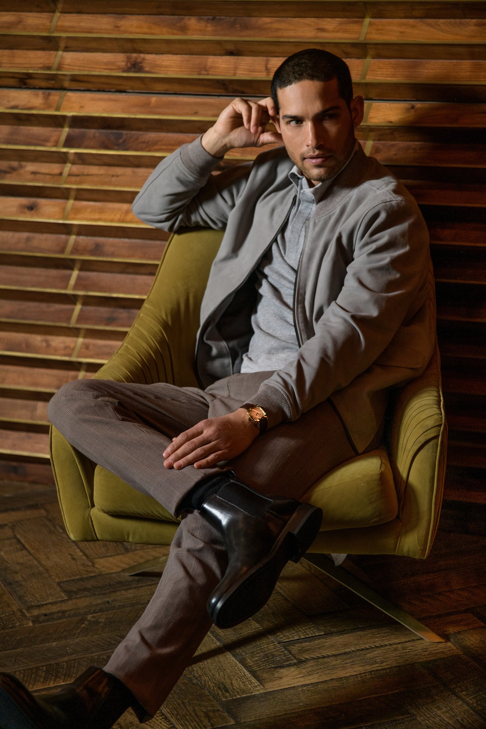 Man sitting in a green armchair, wearing a gray jacket, gray shirt, brown pants, and black boots, with a wooden wall background.