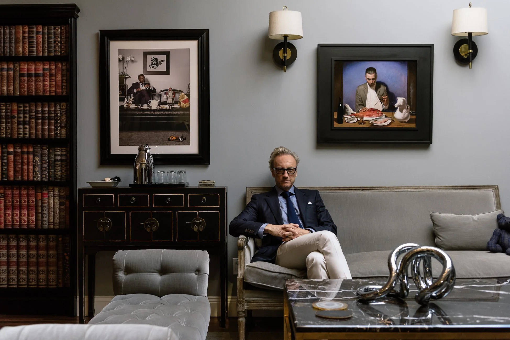 A man with gray hair and glasses sitting on a beige sofa in a modern, stylish room with artwork on the wall, a black cabinet, and decorative sculptures on a marble coffee table.